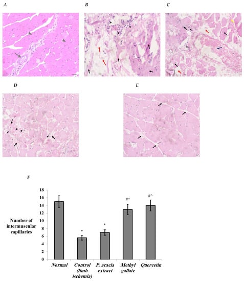 Histopathological investigation of the effects of the P. acacia extract and its isolated compounds (methyl gallate and quercetin) on the gastrocnemius muscle in the experimental rats. (A) normal group, (B) hind limb ischemia control group, (C) P. acacia extract-treated group, (D) methyl gallate-treated group, and (E) quercetin-treated group. (F) Bar charts representing the count of intermuscular capillaries. Data are expressed as the mean ± SD. Data were analyzed using one-way ANOVA followed by Bonferroni’s post hoc test. * Significantly different compared to the normal group, # significantly different compared to the hind limb ischemia control group, ^ significantly different compared to the group treated with the P. acacia extract. Values were considered significantly different at p < 0.05.