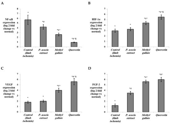 The number of intermuscular capillaries was significantly decreased in the control limb ischemia group compared to normal. Treatment with methyl gallate and quercetin displayed significant increases in numbers of intermuscular capillaries compared to the control limb ischemia and P. acacia extract groups (Figure 4F). The increase in the number of intermuscular capillaries/vessels indicates enhanced therapeutic angiogenesis in hind limb ischemia models [,].