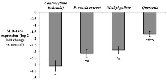 Total RNA, including miRNA, was extracted from the hind limb tissue of the studied groups using a Qiagen miRNeasy Mini kit (Qiagen, Hilden, Germany, Catalog No. 217004) according to the protocol supplied by the manufacturer. RNA concentration and purity were measured spectrophotometrically using a NanoDrop 1000 spectrophotometer (NanoDrop Tech, Wilmington, DE, USA).
