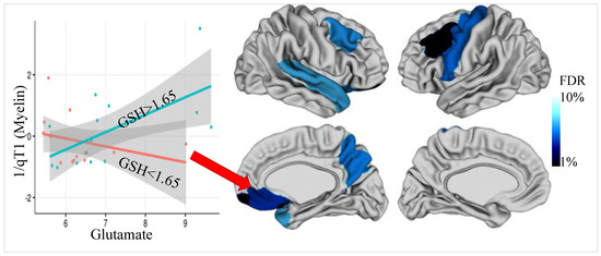 Permissive role of GSH on glutamate-related demyelination. Intracortical myelin (qT1) was mapped at the mid-cortical surface (50% depth between the white matter on pial surfaces) using the CIVET pipeline (https://github.com/aces/CIVET (accessed on 24 October 2021)) with T1-weighted images. Median qT1 values were gathered over cortical regions defined by the Desikan–Killiany Atlas (DKT40). In First Episode Psychosis (n = 30), glutamate relates to reduced prefrontal, orbitofrontal, and superior temporal intracortical myelin (1/qT1) only when GSH levels are also lower (red slope) in the dorsal ACC [MRS voxel not shown]—results were significant in 8 cortical regions after FDR correction (10%). Scatterplot shows the right lateral orbitofrontal cortex [contiguous with the medial surface that is shown on display], indicating significant glutamate-by-GSH interaction effect (t24 = 5.59, p = 9.52 × 10−6) on qT1, accounting for age and sex as covariates in multiple linear regression. Mean age 23.13 (SD 5.30), with 24/6 male/female subjects.