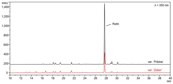The content of total phenols, flavonoids and rutin were higher in the leaf extract of the ‘Pribina’ variety compared to the extract of the ‘Zobor’ variety. In all cases, the differences were highly statistically significant (Table 2). Determination of rutin was provided by the HPLC-DAD and is presented in the chromatogram (Figure 1).