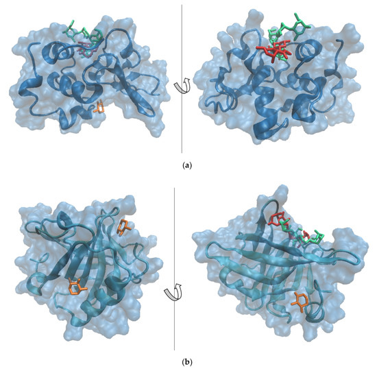 Superposition of the models showing the most probable complexes formed between (a) α-lactalbumin and (b) β-lactoglobulin (represented in blue in surf style) and xylose (represented in orange in licorice style—models 1 and 2), quercetin-4′-O-monoglucoside (represented in red in licorice style) and quercetin-3,4′-O-diglucoside (represented in green in licorice style). Images were prepared using VMD software [42].