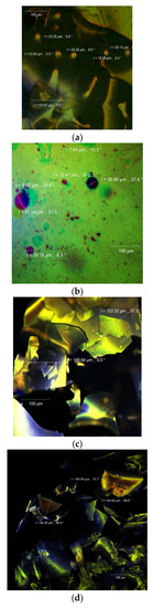 By using a confocal laser scanning Carl Zeiss 710 microscope with the ZEN 2012 SP1 software (Black Edition), the images of V1 and V2 powders (Figure 2) were captured, both in the native state without any other additional dye added (Figure 2a,c) and stained with Congo Red (Figure 2b,d, respectively). In the native state, the powders showed an autofluorescence (in the range of 520–580 nm) due to the rich content of polyphenols among which quercetin predominates [39]. The biologically active compounds were captured in the WPI–X matrix (with a displayed autofluorescence showed in blue). Several irregular scaly formations could be observed with larger dimensions for the V2 (199.6–253.3 µm), compared to V1 (94.5–104.8 µm), probably due to the WPI–X conjugates. The microstructure was rather similar to that reported by Horincar et al. [41], who used different polymers as the encapsulating matrices such as chitosan, maltodextrin and pectin.