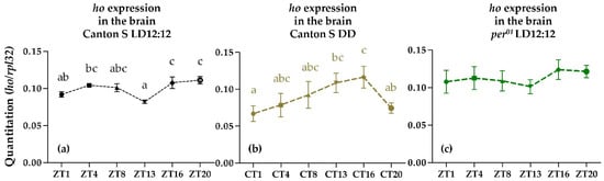 Expression of heme oxygenase (ho) gene in the brain of male wild-type adult D. melanogaster at six time points in LD12:12 (a), DD conditions (b) and in per01 mutant (c) in LD12:12 shown as means ± SD (n = 3 repetitions in each time point). Statistically significant differences between time points are indicated with different letters (p in LD = 0.0046; p in DD = 0.0124; p in per01 = 0.2662). LD: 12 h of light and 12 h of darkness; DD: Constant darkness; ZT: Zeitgeber Time; CT: Circadian Time.