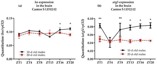 Effects of aging on the daily mRNA expression of heme oxygenase (ho) (a) and autophagy- related 5 (atg5) (b) in the brain of adult male Drosophila melanogaster. Data shown as means ± SD. Statistically significant differences between groups are indicated with asterisks (10-d old males vs. 20-d old males: (*) p < 0.05 or (**) p < 0.01 at ZT16 and ZT20 for ho expression and ZT1, ZT8, ZT13, ZT16 and ZT20 for atg5 expression).