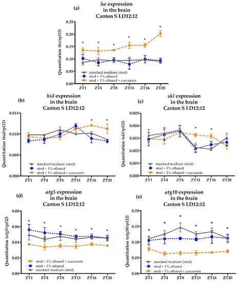 Chronic supplementation of wild-type flies with curcumin strongly induced ho expression. We detected a significant increase in the ho mRNA level in the brain at all time points studied (Figure 4a). We also found that the supplementation of food with curcumin prevented the loss of rhythm in ho expression in the brain of older flies (20 days old). This increase of ho mRNA level in the brain after consecutive 15 days of curcumin feeding was accompanied by the induction of hid expression at ZT16 and ZT20 (Figure 4b). In the same experiment, we also analyzed the expression of the skl gene, another gene coding apoptotic protein, which also showed an increase in mRNA level during the night: ZT13 and ZT16 (Figure 4c). This time-dependent upregulation of apoptotic genes in the brain after long feeding time (15 days) of curcumin, which had a similar effect when the ho gene was overexpressed in all neurons, confirmed association of ho transcription with apoptosis. However, it was not consistent with atg5 expression in the brain after chronic curcumin supplementation, since we found significant reduction in atg5 and atg10 mRNA levels at all time points studied when ho expression was induced by curcumin (Figure 4d,e).