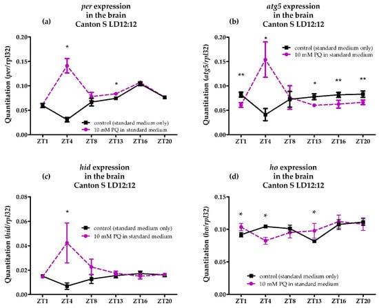 Flies were shown to undergo stress after being exposed to paraquat at 10 mM concentration for 24 h. Firstly, we found a disrupted circadian expression pattern of the per gene in the fly’s brain with the highest mRNA level in the middle of the day (ZT4) (Figure 5a). We also detected a reverse pattern in the daily oscillation of atg5 transcripts in the brain, reaching the maximum level at ZT4 (Figure 5b). Paraquat also induced hid expression at ZT4 which resulted in a different cycling pattern of hid transcription during the day (Figure 5c). The examination of ho mRNA level in the brain after acute paraquat exposure showed changes in the daily pattern of ho expression compared to the control (Figure 5d). We found a significant increase in ho mRNA level in the brain after acute paraquat exposure at ZT1 or ZT13, which in normal condition (LD 12:12) had the lowest mRNA levels. This particular response after acute exposure to paraquat may be explained as a time-dependent protection by ho of the fly’s brain during stress. High activity of males at the beginning of the day and night is correlated with higher exposure to toxic insults, and ho expression seems to be activated in response to stress. The significant decrease of ho mRNA in the brain at ZT4 by paraquat was accompanied by the increase of per, atg5, and hid mRNA.