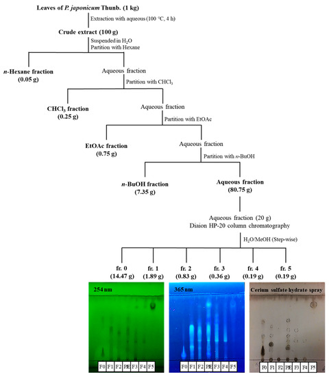 In order to ensure the validation of PJE and reproducibility of efficacy, P. japonicum Thunb., harvested by selecting the region (34°35′24.2″ N, 126°48′09.3″ E, Gangjin-gun, Jeollanamdo, Korea) and season (September), was used in this study. The branches and roots were removed, and only the leaf part was selected and dried in the hot air oven at 45 °C for 48 h. The dried leaves of P. japonicum Thunb. (1 kg) were extracted using 20 volumes of water at 100 °C for 4 h. The extracted solution was then filtered, concentrated with an evaporator under vacuum and spray dried, which gave the PJE sample. For solvent fractionation, the dried water extract (PJE, 100 g) was resuspended in water and partitioned with 𝑛-hexane (3 × 1 L), chloroform (CHCl3; 3 × 1 L), ethyl acetate (EtOAc; 3 × 1 L) and 𝑛-butanol (BuOH; 3 × 1 L) (Figure 1). The samples were dissolved in 50% methanol, sonicated for 20 min and then analyzed using an Agilent 1260 HPLC system (Agilent Technologies, Palo Alto, CA, USA) equipped with an Eclipse XDB-C18 column (4.6 × 250 mm, 5 μm). The temperature of the column oven was maintained at 40 °C. The mobile phase for liquid chromatography (LC) consisted of 0.1% (v/v) formic acid in water (solvent A) and 70% (v/v) acetonitrile in water (solvent B) and was applied as follows: 0–20 min, 2–12.5% (B); 20–30 min, 12.5–13% (B); 30–50 min, 13–40% (B); and 50–51 min, 40–2% (B), followed by re-equilibration with 2% (B) for 51–55 min at a flow rate of 1 mL/min and an injection volume of 10 μL. The detection wavelength was set to 330 nm. Quantitative HPLC analysis was replicated three times.