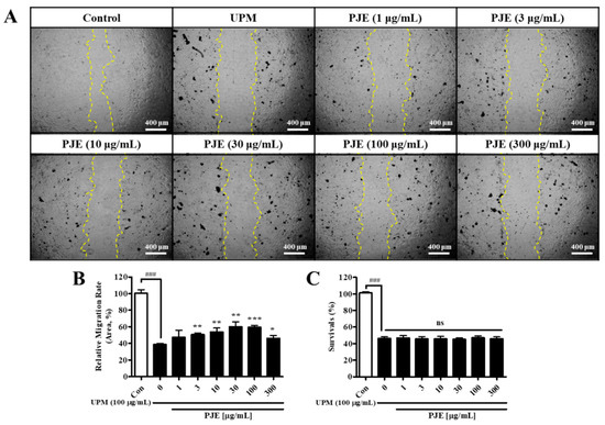 Effects of UPM and PJEs on the migration activity were assessed on the human corneal epithelial cells (HCECs). (A) A scratch was induced to the HCECs treated with UPM and various concentrations of PJE for 24 h. The closed area after 24 h from scratch area were calculated. The scale bars indicate 400 μm. (B) The relative migration rates of HCECs are expressed as the means ± SD. (C) The survival rates of HCECs are expressed as the means ± SD. ### p < 0.001 compared to Con; * p < 0.05, ** p < 0.05, *** p < 0.001 compared to 0 μg/mL PJE; ns, not significant.