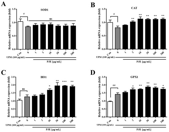 Oxidative stress has been reported to be a major cause of epithelial dysfunction [7,8,47], and the mRNA expression levels of the key antioxidative genes SOD1, CAT, HO1 and GPX1 were quantitated by real-time PCR. CAT, HO1 and GPX1 were significantly upregulated by PJE treatment, and both HO1 and GPX1 were slightly upregulated by UPM, but SOD1 expression did not change (Figure 4). The slight increases shown after UPM treatment were thought to be due to the activation of the host defense because a similar pattern had been reported previously [48]. Enhanced antioxidative gene expression by PJE is expected to be a preventive mechanism of delayed wound healing after UPM exposure.