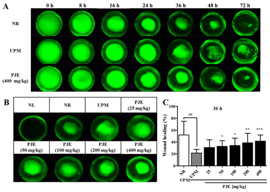 Effects of PJE in a corneal abrasion model after UPM exposure. PJE and UPM were used as pretreatments for 5 days, and 4 mm wounds were generated on the right cornea. Images were obtained at 0, 8, 16, 24, 36, 48 and 72 h by fluorescein staining. (A) Time course images of corneal wound healing in the normal right eye (NR, normal wound), UPM and 400 mg/kg PJE groups. (B) Representative images of each group at 36 h. (C) The wound healing areas were calculated and are presented as the means ± SD. ## p < 0.01 compared to NR; * p < 0.05, ** p < 0.01, *** p < 0.001 compared to UPM.