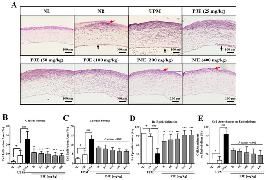 Histological changes during corneal wound healing after treatment with PJE and after UPM exposure. (A) Images of hematoxylin and eosin (H&E) staining of the cornea at 72 h were acquired at 200× magnification, and representative images are shown. Red arrow, re-epithelialized epithelium; black arrow, cell attachment on the endothelium. The infiltration of immune cells in (B) the central stroma and (C) the lateral stroma, (D) the re-epithelialization rate and (E) cell attachment to the endothelium were calculated, and the results are presented as the means ± SD. † p < 0.05, †† p < 0.01 compared to NL; ### p < 0.001 compared to NR; ** p < 0.01, *** p < 0.001 compared to UPM.