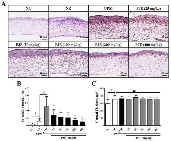 Immunohistological changes in IL-6 expression during corneal wound healing after treatment with PJE and after UPM exposure. (A) Immunohistochemical staining images for IL-6 in the corneas after 72 h were acquired at 200× magnification, and representative images are shown. (B) The intensities of the stained areas were calculated and the data are presented as the means ± SD. (C) The corneal thicknesses were calculated and are presented as the means ± SD. † p < 0.05 compared to NL; ## p < 0.01 compared to NR; * p < 0.05, ** p < 0.01 compared to UPM; ns, not significant.