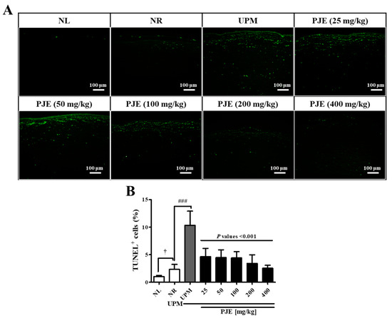 As shown in Figure 8A,B, the few apoptotic cells (2.3%) found in the NR group greatly increased to 10.4% by UPM exposure, which was significantly decreased in all PJE treatment groups, reaching the level of the NR group. Apoptotic cells were mainly distributed in the superficial region of the stroma and showed a slightly different distribution than that of IL-6.