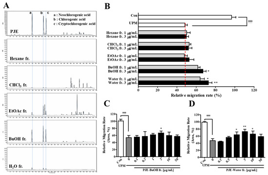 PJE was separated by solvent fractionation, and each fraction and assessed for its preventive effects on wound healing after UPM exposure. The HPLC chromatograms of each fraction are shown in Figure 9A, and the peaks of the major components (CAs) were mainly found in the BuOH fraction. The chloroform, ethyl acetate and water fractions showed CA peaks (approximately 16–20 min), but many other peaks (approximately 36–52 min) were also found in the chloroform and ethyl acetate fractions; notably, the water fraction clearly showed only CA peaks. Among the fractions, both the BuOH and water fractions enhanced the migration activity of the cells (Figure 9B) without altering their survival (Supplement Figure S1A–E). Both the BuOH and water fractions showed increasing migratory activity patterns at concentrations from 0.1 μg/mL to 3 μg/mL, with a slight decrease at 30 μg/mL (Figure 9C,D). The pattern of these data presented a bell-shaped graph, which was the same as the data after PJE treatment, as shown in Figure 3B, although the water fraction showed a better effect than the BuOH fraction. To indirectly determine whether the residual peaks affected migration activity, mixtures of the BuOH and water fractions (1:2, 1:1 and 2:1) were assessed. The migration activities were enhanced by 20% after treatment with the 1:2 and 1:1 mixtures, and this activity was maintained at higher concentrations; additionally, the activity was slightly enhanced up to a concentration 3 μg/mL of the 2:1 mixture and then reduced at higher concentrations (Supplement Figure S2A–C). Therefore, the unknown components corresponding to the residual peaks in the PJE were predicted to inhibit the migratory activity at high concentrations, which was considered to be the cause of the bell-shaped curves.