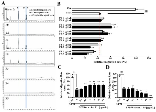 The water PJE fraction was separated with an HP-20 column to purify the effective components and confirm its preventive effects. The HPLC chromatograms of each fraction (F0~F5) are shown in Figure 10A. The peaks from the CAs were mainly found in F1~F2, and some residual peaks appeared in F3~F5. The migratory activities of each fraction (F0~F5) were assessed with a scratch wound healing assay, and the activity after treatment with both F1 and F2 was significantly enhanced, whereas F3~F5 at the same concentrations only slightly inhibited migration (Figure 10B). None of the fractions changed the survival rate of the cells (Supplement Figure S3A–F). F1 showed better migration activity than F2 as expected due to the greater intensity of the HPLC peaks in F1. The migration activity after F1 treatment gradually increased by 22.3% with an increase in the concentration from 0 μg/mL to 1 μg/mL, and this level was maintained at higher concentrations (Figure 10C). However, treatment with F5 led to a serial decrease in activity (Figure 10D).