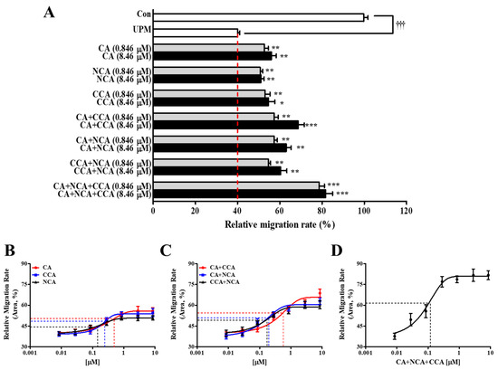 Finally, the results of this study suggested that the preventive effects of PJE on HCEC wound healing after UPM exposure were dependent on the three major compounds CA, NCA and CCA. To confirm the effectiveness of each compound, each CA individually, each mixture of two CAs and a mixture of all three CAs were assessed for their migration activity (Figure 11A). Their concentration ranges were determined similarly to the above-tested PJE levels. All tested CA materials showed significantly increased activity, and mixtures of two or three had better responses than the single agents. None of the CAs changed cell survival (Supplement Figure S4A–C). Their EC50 and ECmax values are shown in Table 2. The EC50 were NCA (0.203 ± 0.040 μM), CCA (0.235 ± 0.069 μM) and CA (0.458 ± 0.170 μM), whereas the ECmax values were NCA (51.0%), CCA (54.7%) and CA (56.0%) (Figure 11B). These results indicate that the response occurred at low concentrations in the order of NCA, CCA and CA but showed the highest effect in the order of CA, CCA and NCA without significance. The ECmax values also showed a similar pattern to the EC50 values. The features of each CA were also displayed as a result of the EC50 values of each mixture of two CAs. The EC50 values of each mixture were CCA + NCA (0.209 ± 0.044 μM), CA + NCA (0.210 ± 0.025 μM) and CA + CCA (0.630 ± 0.062 μM), whereas the ECmax values were CCA + NCA (60.3%), CA + NCA (63.0%) and CA + CCA (68.7%) (Figure 11C). The mixture of three CAs showed the lowest EC50 (0.150 ± 0.020 μM) and the highest ECmax value (81.7%) (Figure 11D). Interestingly, a bell-shaped curve did not appear after CA treatment. These results could be the reason why the animal experiment showed better than expected results because the CAs synergistically enhanced the preventive effects.