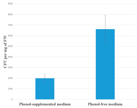 Bacterial density on the plant surface was relatively low, despite the dense inoculum in the free medium (Figure 1). After 5 days of co-cultivation with the duckweeds, there were approximately 2000 CFU per 1 mg of fresh weight (FW) of duckweed in phenol-supplemented medium. Bacterial density was increased more than threefold in phenol-free medium (6600 ± 1300 CFU per 1 mg FW). Since an average bacterial cell weighs an amount of approximately 1 pg, the total biomass of bacteria on the surface of duckweeds was (2 ± 0.4) ng and (6.6 ± 1.3) ng, respectively.