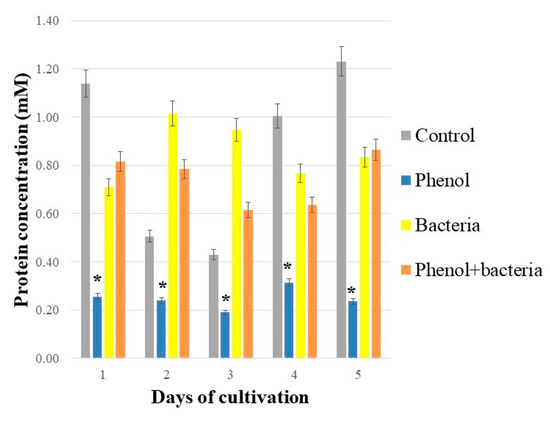 Total soluble proteins of duckweeds cultivated under different experimental conditions: Control—sterile duckweeds cultivated in phenol-free MS medium; Phenol—sterile duckweeds cultivated in phenol-supplemented MS medium; Bacteria—duckweeds inoculated with bacteria H. paralvei and cultivated in phenol-free MS medium; Phenol + bacteria—duckweeds inoculated with bacteria H. paralvei and cultivated in phenol-supplemented MS medium. Concentration of phenol in all experiments was 500 mg L−1. Data represent the mean ± SE (n = 3). * indicates significant difference in treatments at p < 0.05.