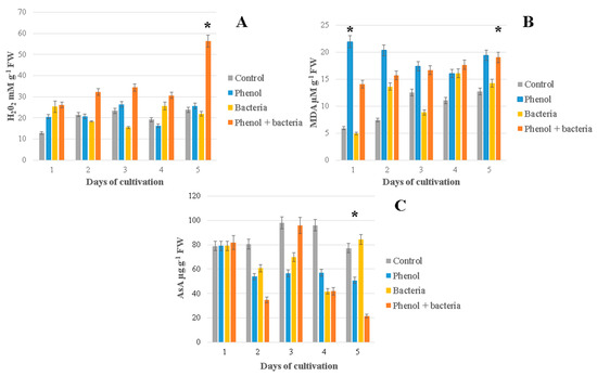 Hydrogen peroxide concentration is significantly higher in duckweeds co-cultivated with bacteria in phenol-supplemented MS medium compared to the sterile duckweeds grown in phenol-supplemented MS medium (Figure 4A). In all other instances, there was no statistically significant difference between treatments. The maximum amount of hydrogen peroxide was achieved after 5 days of cultivation in plants grown with H. paralvei and phenol. On the last day of co-cultivation of duckweeds and bacteria in phenol-supplemented medium, the amount of hydrogen peroxide was almost two times higher compared to previous days (approx. 56.296 mM g−1 FW after day 5 compared to approximately 30 mM g−1 FW on days 1–4).