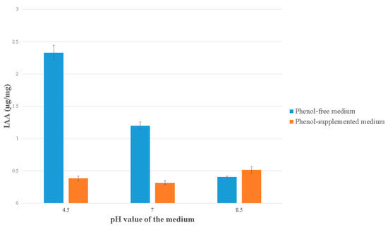 Bacterial indole-3-acetic acid (IAA) production in LB medium with different pH values: phenol-supplemented medium—LB medium with added phenol (500 mg L−1 final concentration); phenol-free medium—LB medium without phenol. Data represent the mean ± SE (n = 3).