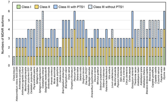 Numbers of MDAR isoforms in charophytes and in land plants. Numbers of MDAR isoforms in land plants and charophytes (Klebsormidium flaccidum NIES-2285 and Chara braunii) are shown. Classes I, II, and III are chloroplastic/mitochondrial, peroxisomal membrane-bound, and cytosolic/peroxisomal isoforms (see Figure 2). Class III enzymes without PTS1 are cytosol-specific isoforms. Unicellular green algae have one or two MDARs (not shown in this figure, see Table S2).