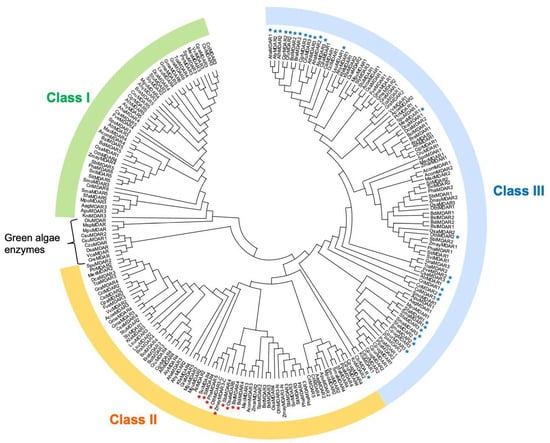 Phylogenetic tree of the MDAR sequences of algae and land plants. The phylogenetic tree was constructed using 220 MDAR sequences from 61 species (10 algae and 51 land plants). Class I enzymes are chloroplastic/mitochondrial isoforms, while class II enzymes are peroxisomal membrane-bound isoforms. Class III MDARs are cytosol/peroxisomal enzymes. Blue asterisks indicate class III enzymes without a peroxisome-targeting signal 1 (PTS1)-like sequence whose subcellular localization is restricted to the cytosol. Red asterisks indicate class II enzymes that lack the adjacent cluster of basic amino acids (e.g., ‘RRRRRW’ of AthMDAR4), and their subcellular localization remains unknown.