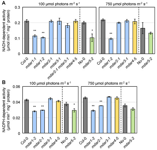 Extractable MDAR activity in the shoots of Arabidopsis thaliana knockout mutants. Arabidopsis thaliana wild-type plants (Col-0 and No-0) and knockout mutants were grown on half-strength MS medium containing 1% sucrose for 2 weeks and then subjected to moderate light (750 µmol photons m−2 s−1) for 24 h. (A) NADH- and (B) NADPH-dependent MDAR activities in the soluble fractions of the shoots were measured. Data are presented as the mean ± SE of at least three biological replicates. Significant differences among genotypes: * p < 0.05, ** p < 0.01 vs. Col-0 or No-0. Student’s t-test was applied to compare No-0 and mdar5-2, while Dunnett’s test was used for the other comparisons.