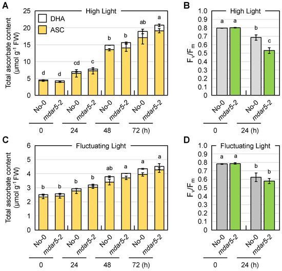 The impacts of AthMDAR5 on the foliar ascorbate profile under light stress conditions. Arabidopsis thaliana wild-type (No-0) and mdar5-2 plants were grown in soil under normal light (100 µmol photons m−2 s−1) conditions for 25 days and then exposed to (A,B) high light (1500 µmol photons m−2 s−1) or (C,D) fluctuating light (see Materials and Methods) for 72 h. (A,C) The total ascorbate content (the sum of the reduced and oxidized forms) in the leaves was measured. The ascorbate redox state (the ratio of the reduced form to the total content) is shown in Table S3. (B,D) The maximum quantum yield of photosystem II (Fv/Fm) was measured before and after stress. Data are presented as the mean ± SE of at least three biological replicates. Different letters indicate significant differences (p < 0.05, Tukey–Kramer test). ASC, reduced ascorbate; DHA, dehydroascorbate (oxidized form).