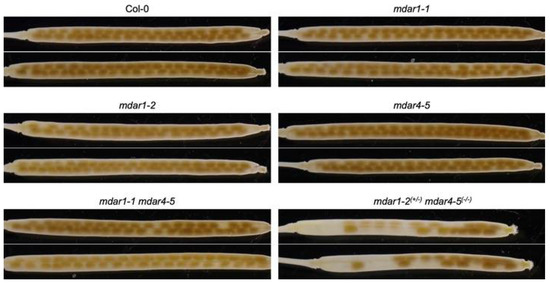 As described above, A. thaliana mutants lacking AthMDAR4 were previously identified as sdp2 mutants, which show seedling-lethal phenotypes in the absence of exogenous sugar treatment [27]. AthMDAR4 is a class II enzyme that binds to the peroxisomal membrane. Peroxisomes harbor another MDAR, the class III AthMDAR1, in their matrix [32]. Thus, we were interested to study whether these two peroxisomal isoforms play complementary or distinct roles. To address this in detail, we attempted to generate double mutants lacking both isoforms by crossing mdar4-5 with mdar1-1 or mdar1-2. From the F2 populations, homozygous mdar1-2 mdar4-5 double mutants were unfortunately not obtained. Since some mutants that were heterozygous for mdar1-2 and homozygous for mdar4-5 (mdar1-2(+/−) mdar4-5(−/−)) were obtained, we allowed these plants to self-pollinate and then performed genotyping on 139 progenies, of which 25% of the seedlings were expected to be homozygous double mutants. However, no homozygous mutants were isolated. The ratio of mdar1-2(+/+) mdar4-5(−/−) (61 seedlings) to mdar1-2(+/−) mdar4-5(−/−) (78 seedlings) was approximately 1.28, and there were many ungerminated seeds. As shown in Figure 5, the siliques of mdar1-2(+/−) mdar4-5(−/−) plants showed both normal and empty seeds, whereas those of wild type and single mutants had only normal seeds. These findings suggest that the double knockout of both isoforms causes embryonic lethality.