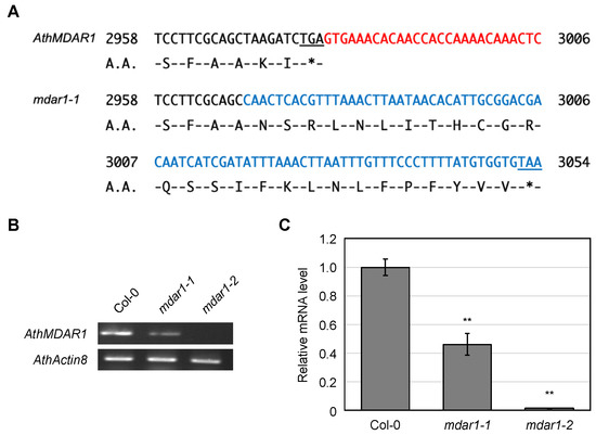The mdar1-1 T-DNA insertion results in an in-frame insertion in the AthMDAR1 gene. (A) The DNA and amino acid sequences around the stop codon in the wild-type (AthMDAR1) and T-DNA-inserted (mdar1-1) genes are shown. The 3′ untranslated region and inserted sequence (derived from T-DNA) are shown in red and blue, respectively. The stop codons are underlined. The T-DNA insertion resulted in an 85-bp in-frame insertion with a new stop codon in the AthMDAR1 gene just before its original stop codon. (B,C) Arabidopsis thaliana wild-type (Col-0), mdar1-1, and mdar1-2 plants were grown on half-strength MS medium containing 1% sucrose for 2 weeks. Shoots from these plants were used for the following reverse transcription (RT)-PCR analyses. (B) Semi-quantitative RT-PCR analysis for AthMDAR1 and AthActin8 (control). The reverse primer (for AthMDAR1) was designed to anneal to just before (upstream of) the T-DNA insertion in the mdar1-1 mutants. (C) Quantitative RT-PCR. The transcript levels of AthMDAR1 genes were analyzed. The value in the wild type was set to 1. Data are shown as the means ± SE of three biological replicates. Significant differences among genotypes (Tukey–Kramer test): ** p < 0.01 vs. the values of the wild-type.
