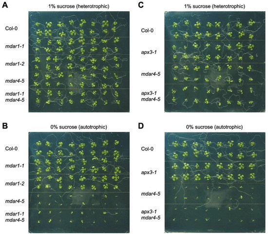 Autotrophic growth of Arabidopsis thaliana mutants lacking AthMDAR1, AthMDAR4, and/or AthAPX3. Arabidopsis thaliana wild-type plants (Col-0) and knockout mutants were grown on half-strength MS medium, with (A,C) or without (B,D) 1% sucrose, for 10 days and then photographed. (A,B) Representative pictures of 10-day-old wild type, mdar1-1, mdar1-2, mdar4-5, and mdar1-1 mdar4-5. (C,D) Representative pictures of 10-day-old wild type, apx3-1, mdar4-5, and apx3-1 mdar4-5.
