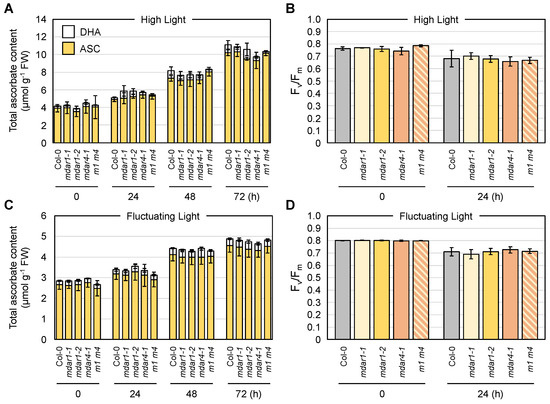 The impacts of AthMDAR1 and 4 on the foliar ascorbate profile under light stress conditions. Arabidopsis thaliana wild-type (Col-0), mdar1-1, mdar1-2, mdar4-5, and mdar1-1 mdar4-5 (m1 m4) plants were first grown on half-strength MS medium containing 1% sucrose for 1 week. This was because the loss-of-function of AthMDAR4 results in a seedling-lethal phenotype in the absence of exogenous sugar application. Plants were then transferred to soil and grown for a further 3 weeks. Four-week-old plants grown under normal light (100 µmol photons m−2 s−1) conditions were exposed to (A,B) high light (1500 µmol photons m−2 s−1) or (C,D) fluctuating light (see Materials and Methods) for 72 h. (A,C) The total ascorbate content (the sum of the reduced and oxidized forms) in the leaves was measured. The ascorbate redox state (the ratio of the reduced form to the total content) is shown in Table S3. (B,D) The maximum quantum yield of photosystem II (Fv/Fm) was measured before and after stress. Data are presented as the mean ± SE of at least three biological replicates. There were no significant differences in the ascorbate profiles and Fv/Fm values among the genotypes at any time (Tukey–Kramer test). ASC, reduced ascorbate; DHA, dehydroascorbate (oxidized form).