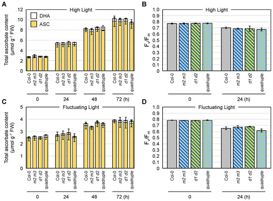 The combined impacts of cytosolic MDARs and DHARs on the foliar ascorbate profile under light stress conditions. Arabidopsis thaliana wild-type (Col-0), mdar2-1 mdar3-1 (m2 m3), dhar1-1 dhar2-1 (d1 d2), and mdar2-1 mdar3-1 dhar1-1 dhar2-1 (quadruple mutant) plants were grown in soil under normal light (100 µmol photons m−2 s−1) conditions for 25 days and then exposed to (A,B) high light (1500 µmol photons m−2 s−1) or (C,D) fluctuating light (see Materials and Methods) for 72 h. (A,C) The total ascorbate content (the sum of the reduced and oxidized forms) in the leaves was measured. The ascorbate redox state (the ratio of the reduced form to the total content) is shown in Table S3. (B,D) The maximum quantum yield of photosystem II (Fv/Fm) was measured before and after stress. Data are presented as the mean ± SE of at least three biological replicates. There were no significant differences in the ascorbate profiles and Fv/Fm values among the genotypes at any time (Tukey–Kramer test). ASC, reduced ascorbate; DHA, dehydroascorbate (oxidized form).