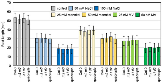 However, we did not find any differences in the ascorbate profiles and photooxidative damage among the genotypes (Figure 9, Figures S15 and S16). Considering that the cytosol-specific enzymes (especially AthMDAR2) might be much more important in the roots (Figure 3), we also checked the sensitivity of the mutant roots to methyl viologen (oxidative stress), salt, and mannitol (osmotic stress) by measuring their primary root length. The root growth of the wild-type plants was obviously inhibited by these stresses in a dose-dependent manner; however, the lack of either or both cytosolic MDARs and DHARs did not promote root growth inhibition (Figure 10).