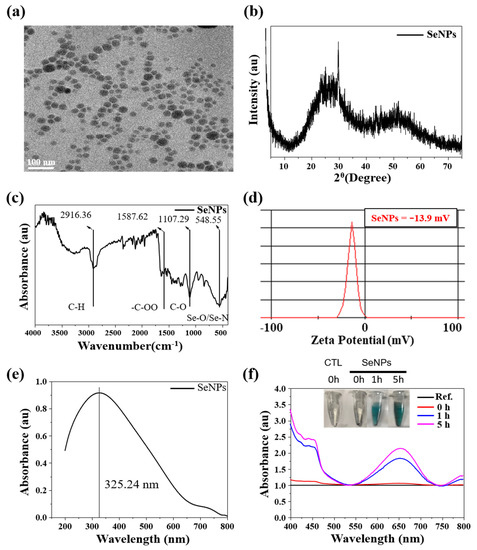 Characteristics0 of SeNPs were investigated to check as-designed size, shape, and chemical composition. The HR-TEM image of SeNPs is shown in Figure 1a. The SeNPs were spherical, with a size of 35.6 ± 4.3 nm. Next, we investigated the crystal phage structure of the SeNPs. The XRD patterns of SeNPs are shown in Figure 1b and they exhibited two broad peaks at 2θ = 20–30° and 45–55°, demonstrating a combination of crystalline and amorphous phases of the nanoparticles [43]. The FTIR spectra of the SeNPs are presented in Figure 1c. The sharp and intense peak at 2916.36 cm−1 corresponds to the –CH group, the peak at 1587.62 cm−1 corresponds to the –COO group, and the peaks at 1107.29 and 548.55 cm−1 correspond to the –CO and Se-O groups [44,45]. The obtained FTIR spectra were similarly detected in other selenium particles [26]. The surface charge of the SeNPs was analyzed by zeta potential, confirming that SeNPs are negatively charged, as shown in Figure 1d. The surface charge of the SeNPs was −13.9 mV, which is mainly due to the presence of –COO, –CO, and –OH chemical groups on the surface, as confirmed by FTIR assessment. It is worthy to note that higher zeta potential was suitable for stable particle colloidal suspensions. Finally, the optical properties of the SeNPs were analyzed by UV-visible spectroscopy. The absorption spectra of the SeNPs are presented in Figure 1e. The SeNPs exhibited a broad absorption peak at 325.24 nm.