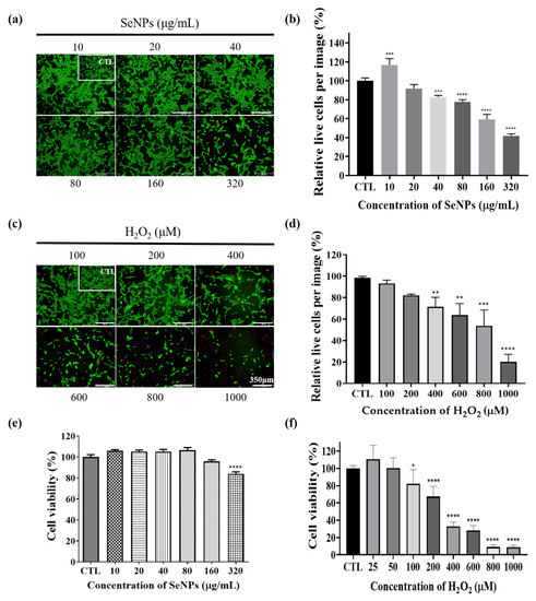 Cell viability was determined by live (green) and dead (red)-staining, and CCK-8 assays. After cell seeding for 24 h, C2C12 cells were analyzed using CCK-8 solution and stained using live/dead solution to evaluate viability. (a) Live/dead-staining following treatment with various SeNPs concentrations. (b) The quantitative live/dead assay results, which were treated with SeNPs. (c) Live/dead-staining following treatment with various H2O2 concentrations. (d) The quantitative live/dead assay results, which were treated with H2O2. (e) The relative cell viability of C2C12 cells cultured in different SeNPs concentrations. (f) Viability of C2C12 cells treated with various concentrations of H2O2. All data was normalized by control cell numbers. The statistical significance of (e,f) was calculated using one-way analysis of variance (ANOVA), followed by a two-sided Dunnett’s multiple comparison test compared to the control (CTL; scale bar = 350 μm). * Represents p < 0.05, ** p < 0.01, *** p < 0.001, and **** p < 0.0001; n = 3., * compared with the SeNPs and H2O2-untreated groups.