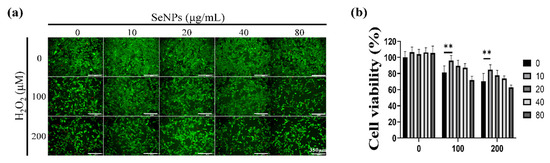 To examine the cellular cytotoxicity under both SeNPs and H2O2, C2C12 cells were plated in a 96-well plate at a seeding density of 5 × 103 cells. Then, SeNPs (0–80 μg/mL) were treated to cells with or without H2O2 (100 or 200 μM) for 1 day. The cell viability assay and live/dead-staining were performed as we described above.