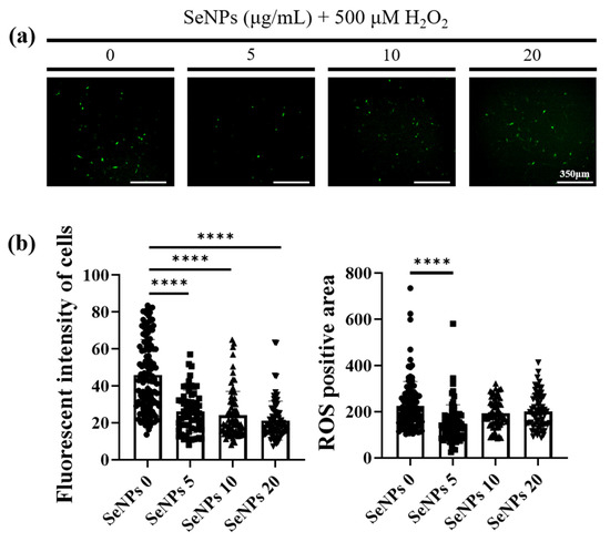 As high levels of ROS have been reported to induce apoptosis and inhibit the differentiation of muscle progenitor cells during repair and regeneration [51], ROS-staining was analyzed to confirm the ability of SeNPs to regulate ROS. To measure intracellular ROS production, we used 5-(and-6)-carboxy-29,79-dichlorodihydrofluorescein diacetate (carboxy H2DCFDA) after SeNPs and 500 μM of H2O2 treatment. In total, 500 μM of H2O2 was selected to maximize the ROS production within the limitation of ROS dye sensitivity and to investigate the antioxidant role of SeNPs in a high-ROS environment [26,52]. The ROS production was confirmed at the 4th hour because it showed toxicity after 24 h. In addition, we wanted to confirm the dramatic cytoprotective and antioxidant effects at high H2O2 concentrations, such as 500 μM, and the low intensity of ROS-staining at 200 μM, confirming cell viability. As shown in Figure 4a, control cells showed a large number of fluorescent cells. In contrast, the cells treated with 5 μg/mL of SeNPs showed weak fluorescence, indicating that 5 μg/mL of SeNPs efficiently controlled ROS. Furthermore, it has been suggested that ROS may affect several cellular activities. Figure 4b shows the results obtained by analyzing the intensity and positive areas of staining using ImageJ. As a result of the intensity analysis of fluorescently stained cells, the SeNP-treated group showed a lower intensity than the untreated group and the highest decrease was observed at 5 μg/mL of SeNPs. ROS generated through various extracellular and intracellular actions attract attention as novel signaling mediators involved in the growth, differentiation, progression, and death of cells [53]. Previous studies have shown that another type of stress (heat) possibly causes overproduction and accumulation of ROS, resulting in damage to cells, and SeNPs could protect the apoptosis of C2C12 induced by high ROS [49]. These results, in addition to previous studies revealing the therapeutic role of SeNPs as antioxidants, suggest that SeNPs protect cells by regulating ROS and may be involved in various cellular activities [54,55].