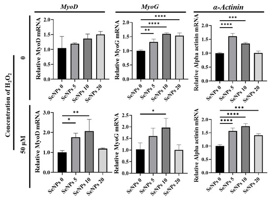To confirm the effect of SeNPs, qRT-PCR was used to investigate the myogenic-relative mRNA expression levels such as MyoD, one of the earliest markers of myogenesis; MyoG, known as a transcription factor for myoblast differentiation; and α-Actinin, which is involved in the assembly and maintenance of muscle fibers. Figure 5 shows that SeNPs effectively up-regulated myogenic-relative genes after 5 days of culture in differentiation media with or without H2O2. In the absence of H2O2, the expression of the MyoD gene did not show any significant differences. The expression of the MyoG gene was 1.32 ± 0.1–1.60 ± 0.04 in all SeNP-treated groups and α-Actinin gene expression increased to 1.61 ± 0.1 and 1.35 ± 0.04 when the cells were treated with 5–10 μg/mL of SeNPs. Under H2O2 conditions, the expression of the MyoD gene increased to 1.77 ± 0.29 and 2.39 ± 0.25 when treated with 5–10 μg/mL of SeNPs. The expression of the MyoG gene was 1.73 ± 0.06 in the group treated with 10 μg/mL of SeNPs and the α-Actinin gene increased to 1.39 ± 0.08~1.78 ± 0.1 in all groups treated with SeNPs. In addition to the previous study which found that antioxidant ascorbic acid (200 μM) can promote the differentiation of C2C12 cells, it was confirmed that SeNPs (5–20 μg/mL) could also be effective in differentiation promotion in C2C12 cells [56]. Along with the therapeutic result of seleno-proteins to myogenic cells challenged with heat stress-induced high ROS, in which MyoD and MyoG were upregulated in the presence of selenoproteins [57], it was confirmed that not only heat stress but also ROS could be modulated to influence differentiation.