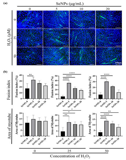 To evaluate whether SeNPs are effective in the differentiation of C2C12 cells, immunocytochemistry (ICC)-staining was performed on the 5th day after replacement with myogenic differentiation media (Figure 6a). To quantify the degree of differentiation, the myotube fusion index was calculated by the proportion of nuclei in myotubes to the total nuclei. To quantify and analyze the degree of differentiation of C2C12 cells, the fusion index and area of the myotube were analyzed. First, in the H2O2 untreated group, the fusion index increased by approximately 14% in the 5 μg/mL of the SeNPs-treated group compared to the untreated SeNPs group and no significant differences were found in the area. In the 25 μM of the H2O2 treatment group, the fusion index increased by approximately 13–29% in the SeNPs treatment group and the area increased by approximately 6–9. In the 50 μM of the H2O2 treatment group, the fusion index increased by approximately 14–23% in the 5–10 μg/mL of the SeNPs treatment group and the area increased by approximately 4–10 (Figure 6b). From these results, we confirmed that the expression of myogenic markers increased upon SeNPs treatment compared to the untreated group and also SeNPs can be involved in myogenesis by regulating ROS even in a ROS environment induced by H2O2. In a previous study, heat stress induced the downregulation of the C2C12 gene and the seleno-protein had a potential protective effect under heat stress [49]. In addition, we confirmed the potential protective effect against damage to C2C12 cells and the upregulation of both the gene and protein expression even in the ROS environment.