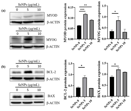 It was confirmed that SeNPs protect cells from ROS and promote differentiation in the ROS condition. Next, we identified major apoptotic signaling molecules, such as BAX and BCL-2, and major myogenesis signaling molecules, such as MYOD and MYOG, by western blot analysis. This experiment was conducted at a concentration of 5–10 μg/mL of SeNPs, which confirmed a higher level of differentiation through ICC-staining with MHC. In the case of MYOD, the SeNP-treated group showed a significant increase in expression level compared to the untreated group (Figure 7a). However, in the case of MYOG, only the 5 μg/mL of the SeNPs treatment group showed an increase in expression (Figure 7a). Similar to the myogenic effect from another natural antioxidant (curcumin, 1 μM) displaying enhanced MHC (muscle differentiation marker), we observed enhancement of myogenic proteins [58]. In the case of BCL-2, an antiapoptotic factor, a significant increase was confirmed in the 5 μg/mL of the SeNPs treatment group (Figure 7b); in the case of BAX, the 5 μg/mL of the SeNPs treatment group showed similar results to the untreated group (Figure 7b). These data show not only enhanced expression of markers at the RNA level but also enhanced expression at the protein level. In support of previous studies showing that SeNPs play an important role in ROS regulation by analyzing apoptosis signals [32,35], their role in protecting cells from ROS and promoting myoblast differentiation was confirmed.