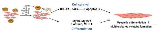 The purpose of this study was to investigate the efficiency of apoptosis protection and differentiation promotion through ROS regulation of SeNPs in the ROS environment in C2C12 cells. The findings of this study are schematically presented in Figure 8, which illustrates a series of antioxidant effects of the SeNPs during the myogenic differentiation. This study revealed that SeNPs effectively restored C2C12 cells from the constant H2O2 exposure environment via down-regulation of ROS and enhanced myogenic differentiation in both normal and high-ROS conditions. In particular, SeNPs increased myogenic-related mRNA levels (MyoD, MyoG, and α-actinin) and promoted multinucleated mature myoblasts. Additionally, SeNPs enhanced the production of the myogenic protein (MYOD and MYOG) and anti-apoptotic protein (BCL-2). Collectively, it can be concluded that SeNPs showed the potential for skeletal muscle repair by acceleration of myogenic differentiation via tuning the ROS production. Along with the ROS regulatory pathway of SeNPs in the myogenic differentiation condition, the clinical effectiveness of SeNPs for muscle tissue regeneration needs to be reinforced in future animal studies.