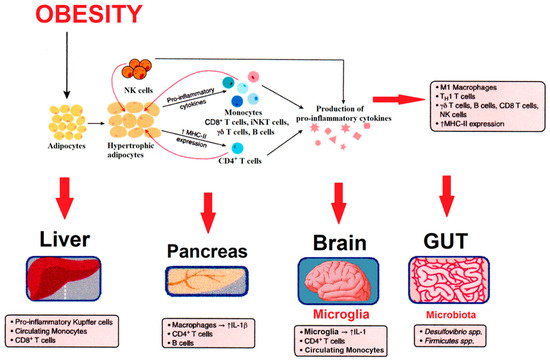 Different pathologies, such as cardiovascular diseases, neuro-inflammation, resulting in neurodegenerative diseases, metabolic syndrome, and type 2 diabetes, have been associated with increased secretion of inflammation-promoting cytokines. Inflammatory cytokines are produced by different cell types and secreted into the circulation, where they regulate different tissues through their activities. There has been a great interest in determining the metabolic consequences of obesity derived from the current diet, in which foods are usually rich in carbohydrates and fats. Among the most important results obtained was the relationship observed between obesity and inflammation. The specific factors that initiate inflammation are not known completely yet and, probably, differ among diverse organs and tissues, but are associated with the activation of the innate immune system in response to cellular homeostasis alterations [17,18,19].