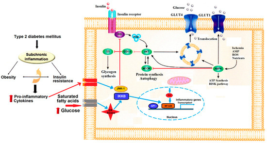 Binding of insulin stimulates the association of its receptor with downstream mediators, including insulin receptor substrate-1 (IRS-1) and PI3K. The PI3K/AKT/GSK-3β signaling pathway is involved in insulin signaling transduction, and GSK3β is regulated and controlled by insulin in this signaling pathway, which is related to glycogen synthesis regulation. Through specific receptors, hyperglycemia, fatty acids, and pro-inflammatory cytokines, as well as ROS, activate JNK and IKKB favoring NF-κB translocation into the nucleus and, therefore, transcription of inflammatory genes.