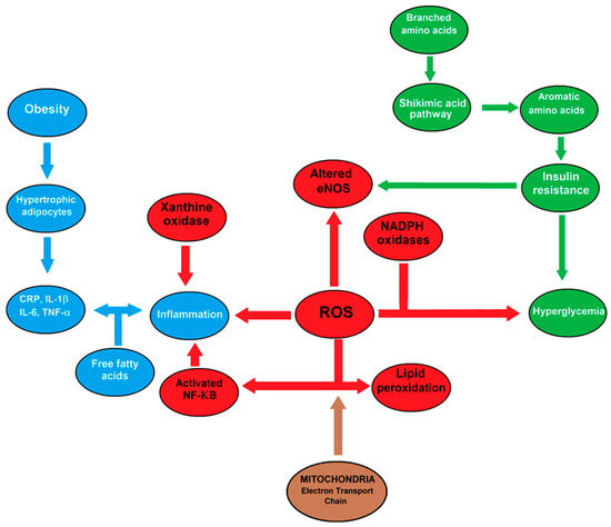 Reactive oxygen species (ROS) play a central role in the interactions involving inflammation, oxidative stress, and metabolic control. Hyperglycemia increases ROS production and chronic inflammation. Altered expression of miRNAs and epigenetic regulation of oxidative stress genes are contributing factors to hyperglycemic memory. Sources of ROS include NADPH oxidase, dysfunctional endothelial nitric oxide synthase (eNOS), and xanthene oxidase. Excessive production of ROS can exacerbate and contribute to the pathogenesis of insulin-resistance and impaired insulin secretion. In addition, high levels of branched-chain amino acids (BCAAs) are often associated with increased BMI levels and insulin resistance whereas low levels of BCAAs are accompanied by lower BMIs and good insulin sensitivity.