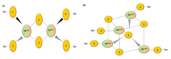 Iron–sulfur clusters can be divided into various geometric and stoichiometric forms in which the number of iron and sulfur atoms involved in clusters changes []. The simplest [Fe–S] cluster consists of one iron ion bound to a polypeptide by L-cysteine residues []. Rhombic [2Fe–2S] (Figure 1a) and cubane [4Fe–4S] clusters (Figure 1b) are the most prevalent groups []. Square-like cubane-type iron–sulfur clusters [4Fe–4S] can be produced from two units of [2Fe–2S] clusters [], and this reaction can be reversed under specific conditions []. The loss of one of the atoms results in a non-symmetrical [3Fe–4S] or [8Fe–7S] structure [,]. Thus, the iron–sulfur clusters can undergo various transformation processes such as conversion, coordinating ligand exchange, and degradation in oxidative stress [,].