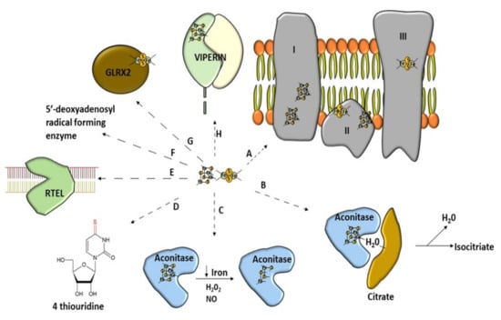 Wide range of use of [Fe–S] clusters. (A) Mitochondrial respiratory chain–NADH dehydrogenase (complex I), succinate dehydrogenase (complex II), Cytochrome bc1 (complex III). (B) Non-redox catalysis (aconitase), (C) regulatory function of aconitase after oxidative stress, (D) involvement in tRNA modification, threonylcarbamoyladenosine tRNA methylthiotransferase (CDKAL1), (E) participation of Fe–S cluster in genome integrity; RTEL (helicase-nuclease DNA2 and regulator of telomere length 1), (F) molybdenum cofactor biosynthesis protein 1 (MOCS1A, a member of the S-adenosylmethionine (SAM)-dependent enzyme family) is an enzyme using the Fe–S cluster to generate a 5′-deoxyadenosyl radical, (G) glutaredoxins with Fe–S clusters are involved in Fe–S cluster synthesis, (H) antiviral proteins using Fe–S cluster to perform their activity (Viperin).
