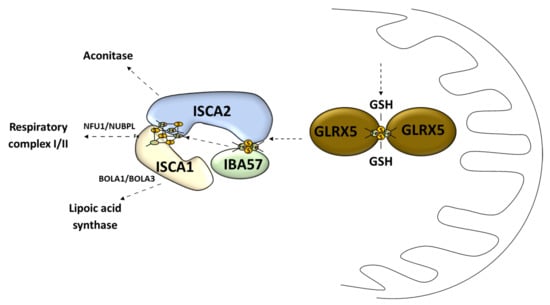 The second stage of the Fe–S cluster formation takes place in the mitochondria where the [4Fe–4S] cluster is made of two [2Fe–2S] clusters []. This process is called the late-acting machinery []. It depends on the [2Fe–2S] cluster pass to form a working complex carried out by GLRX5 [] (Figure 4). The late-step assembly machinery has been proposed to form the ISCA1–ISCA2–IBA57 complex that does not interfere with early stage components []. Recently it has been shown that this complex can convert the [2Fe–2S] cluster into the [4Fe–4S] cluster, which was demonstrated in vitro []. Sheftel et al. showed that the presence of all three proteins was crucial for optimal [4Fe–4S] cluster assembly and was conserved in its nature [] (Figure 4). The association scheme of components of this pathway can be different under specific conditions, but it still remains unclear [,] (Figure 4). The late-acting machinery is essential in the production of the [4Fe–4S] clusters for aconitase-type protein [], succinate dehydrogenase, radical SAM enzymes, and lipoic acid synthase []. The synthesis and delivery of the Fe–S cluster for specific proteins requires additional transporters: NFU1 and NUBPL in cluster formation for the respiratory complex 1; BOLA1 and BOLA3 in cluster delivery for lipoic acid synthase [] (Figure 4).