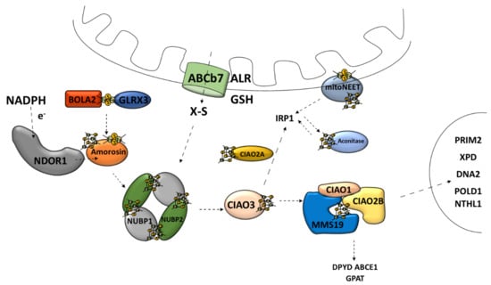 The second major route of the Fe–S cluster assembly pathways is the cytosolic Fe–S cluster assembly machinery, also referred to as the cytosolic iron–sulfur cluster assembly (CIA) []. CIA is responsible for the Fe–S cluster assembly for cytosolic and nucleic Fe–S proteins []. This is a multistage process consisting of at least two stages: the nascent cluster assembly upon the scaffold complex and delivery to apo-protein []. The scaffold complex consists of NUBP1–NUBP2 protein [,] (Figure 5). Such a complex has the ability to bind two [4Fe–4S] clusters on one NUBP1 monomer []. The assembly process requires electrons, which are provided by diflavin oxidoreductase (NDOR1) in cooperation with amorosin from NADPH [,] (Figure 5). A recent observation describes an interaction between the mitochondrial and cytosolic Fe–S protein assembly machinery linked by NEET proteins (mitoNEET) in which the Fe–S cluster is coordinated by three Cys residues and one His residue []. It is anchored into the outer membrane of the mitochondrion with one of its parts located in the cytosol []. Under oxidative conditions, various connections between the mitoNEET cluster allow for the transfer of this cluster via the protein–protein interaction into the apo-form of proteins, such as the bacterial FDX [], IRP1 [], or amorosin []. Protein BOLA2 forms a protective complex with glutaredoxin 3 (GLRX3) allowing for the transfer of the newly formed [2Fe–2S] cluster from the mitochondria through the cytosol and taking part in the GLRX3–BOLA2-dependent amorosin maturation pathway [,] (Figure 5).